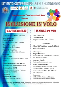 Giovedì 16 Aprile alle ore 18.30 e Venerdì 17 Aprile alle ore 19.00 il nostro Istituto, in collaborazione con il Comune di Casarano, l’Associazione Amici di Nico, la Diocesi di Nardò-Gallipoli, ha organizzato l’iniziativa INCLUSIONE IN VOLO presso il Teatro Parrocchia “Cuore Immacolato di Maria” – Casarano.